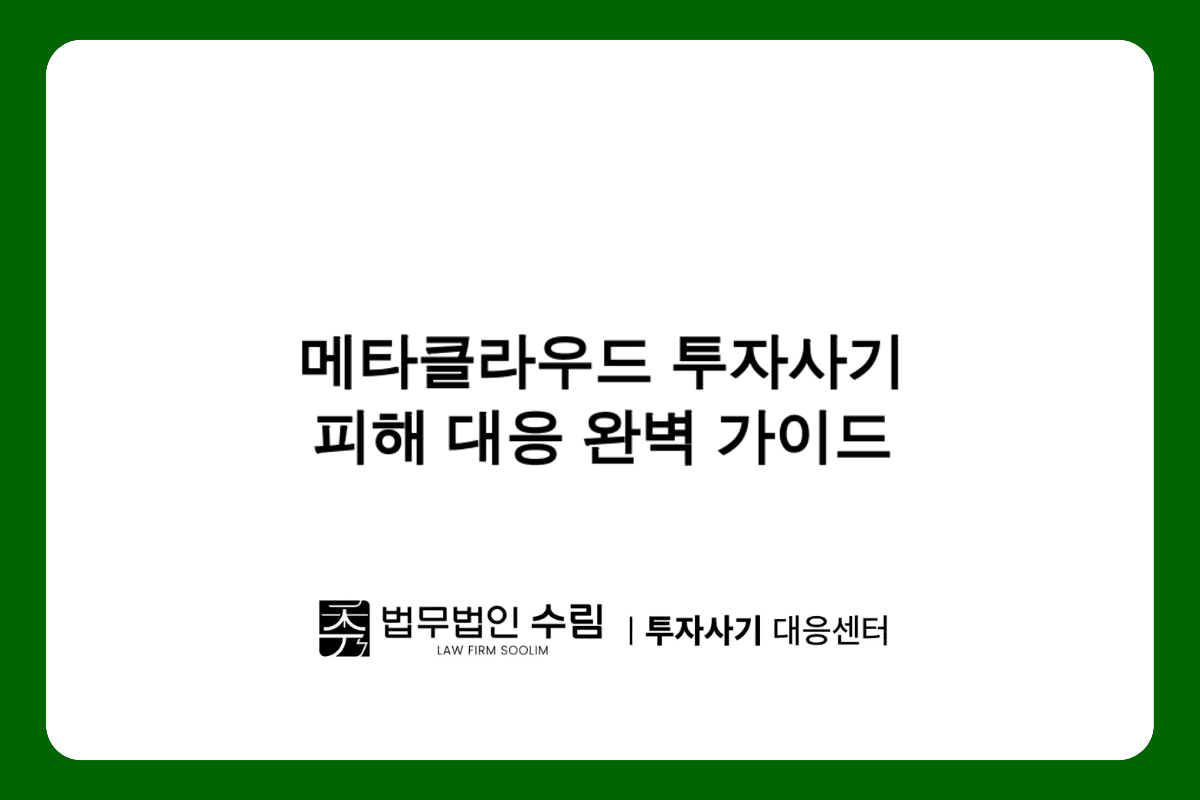 메타클라우드를 비롯한 각종 투자사기 피해를 입으신 분들께서는 시간이 지날수록 피해 회복이 어려워질 수 있으므로 조속한 법적 대응이 필요합니다. 법무법인 수림 투자사기 대응센터에서는 투자사기 피해자들을 위한 개별적이고 전문적인 법률 서비스를 제공하여 신속한 피해 구제를 위해 최선을 다하고 있습니다.